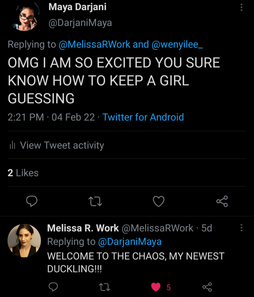 So for the first time in weeks I wade into the teaser hashtag and lo and behold, Melissa posts something cryptic about someone in the mentor Slack keeping it chaotic up until the last minute which obviously means it was her.